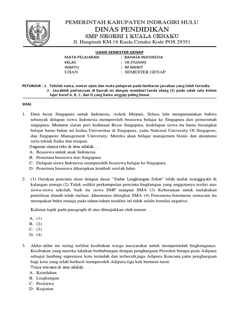 Ujian Akhir Semester (UAS) merupakan momen penting bagi siswa untuk mengevaluasi pemahaman mereka terhadap materi yang telah dipelajari selama satu semester. Bagi siswa Kelas 7 Sekolah Menengah Pertama (SMP) yang mengikuti Kurikulum 2013, persiapan menghadapi UAS Bahasa Indonesia semester 1 perlu dilakukan secara matang. Artikel ini akan membahas contoh-contoh soal UAS Bahasa Indonesia Kelas 7 Semester 1 Kurikulum 2013, lengkap dengan penjelasan singkatnya, untuk membantu siswa dalam mempersiapkan diri.