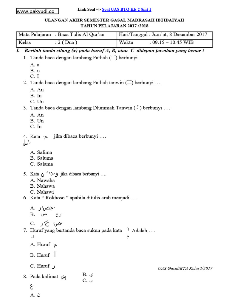 Belajar membaca dan menulis Al-Quran (BTQ) merupakan fondasi penting dalam pendidikan agama Islam. Bagi siswa kelas 2 semester 1, pemahaman dasar tentang huruf hijaiyah, harakat, dan cara membaca Al-Quran dengan benar menjadi krusial. Artikel ini akan membahas secara komprehensif soal-soal BTQ yang umum diberikan pada kelas 2 semester 1, lengkap dengan contoh soal, pembahasan, dan tips belajar efektif.